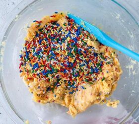 - Mix the cake mix, egg, egg yolk, vanilla, and cooled melted butter in a large bowl until smooth and incorporated. Fold in the sprinkles.