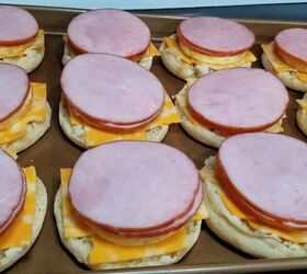 - Lay out the bottom halves of the English muffins on a large cookie sheet and begin layering the cheese, egg, and Canadian bacon. If the cheese is hanging over edges of the muffin, break it in half and lay the pieces in a cross position.