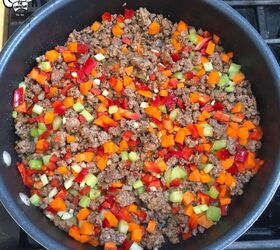 Do you ever think things are going great in the kitchen but then you look down and realize something’s missing? That ‘something’ this time was the onions still on the chopping board! My new motto now is never sweat the small stuff – just the onions. Since Hubs is always on perpetual clean up duty when I cook, it’s not a big deal to cook them separately and add them into the rest of the mixture 😉.