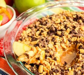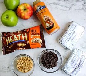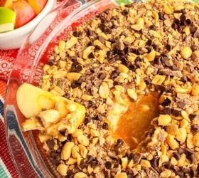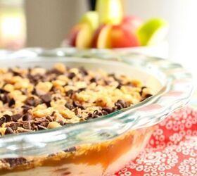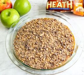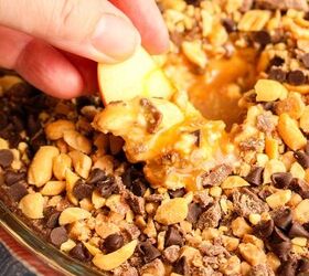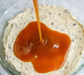 - Pour a drizzle of caramel sauce on top of the dip. Top with the remaining Heath bits.