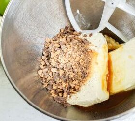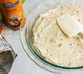 - Beat cream cheese and vanilla with ½ cup caramel dip and ½ cup toffee bits until blended evenly in a medium mixing bowl using a hand mixer or a stand mixer.